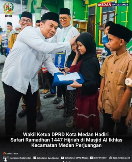 Medan — Suasana Ramadan terasa hangat di Masjid Al Ikhlas yang berlokasi di Jalan Pimpinan Gang Suka Damai, Kecamatan Medan Perjuangan. Di tempat ini, kegiatan Safari Ramadan Pemerintah Kota Medan Tahun 1447 Hijriah digelar dengan nuansa religius—dan tentu saja, penuh kebersamaan, Senin (16/03/2026).